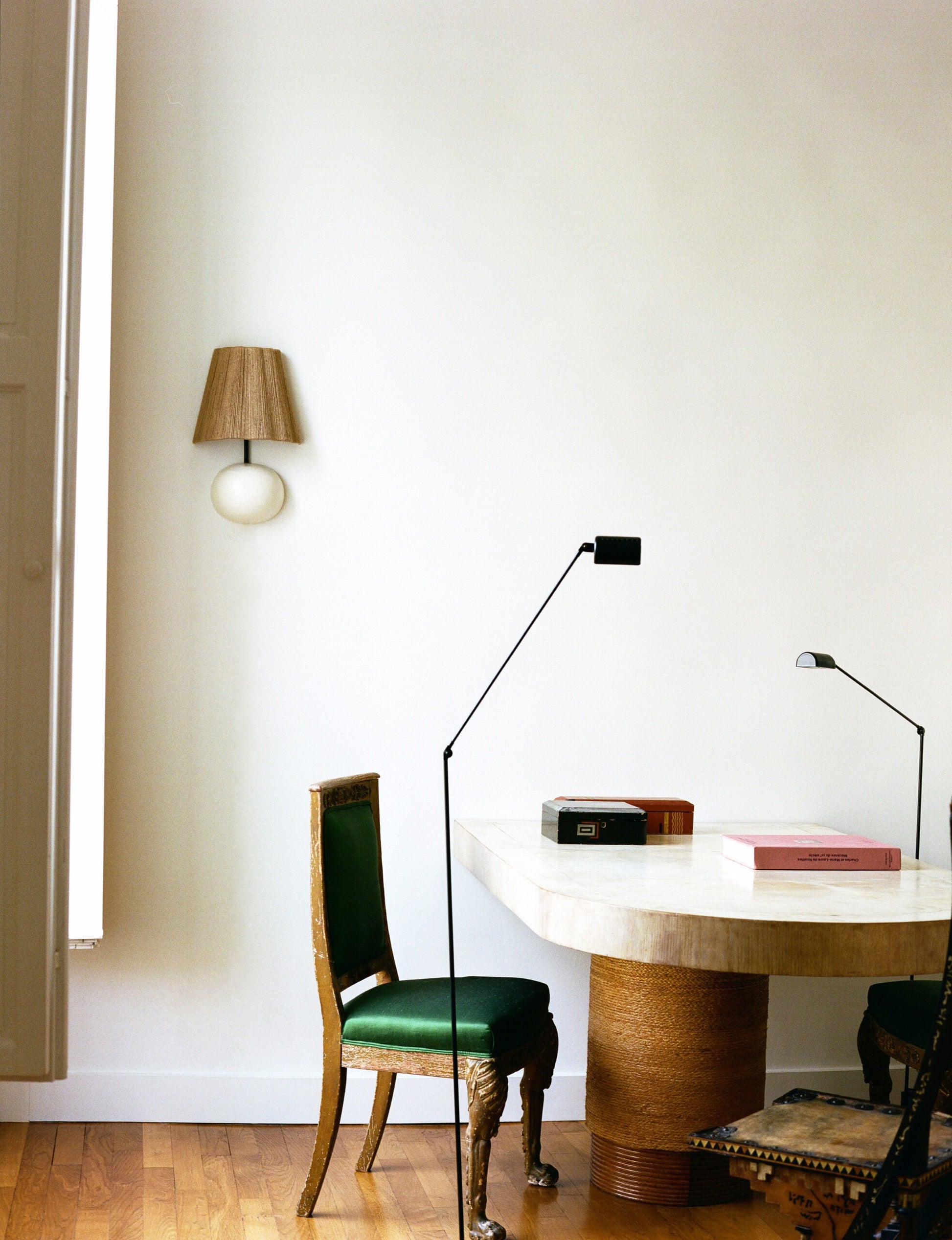 L'abat-jour demi-rond de style empire est recouvert de jute pour créer de la texture.