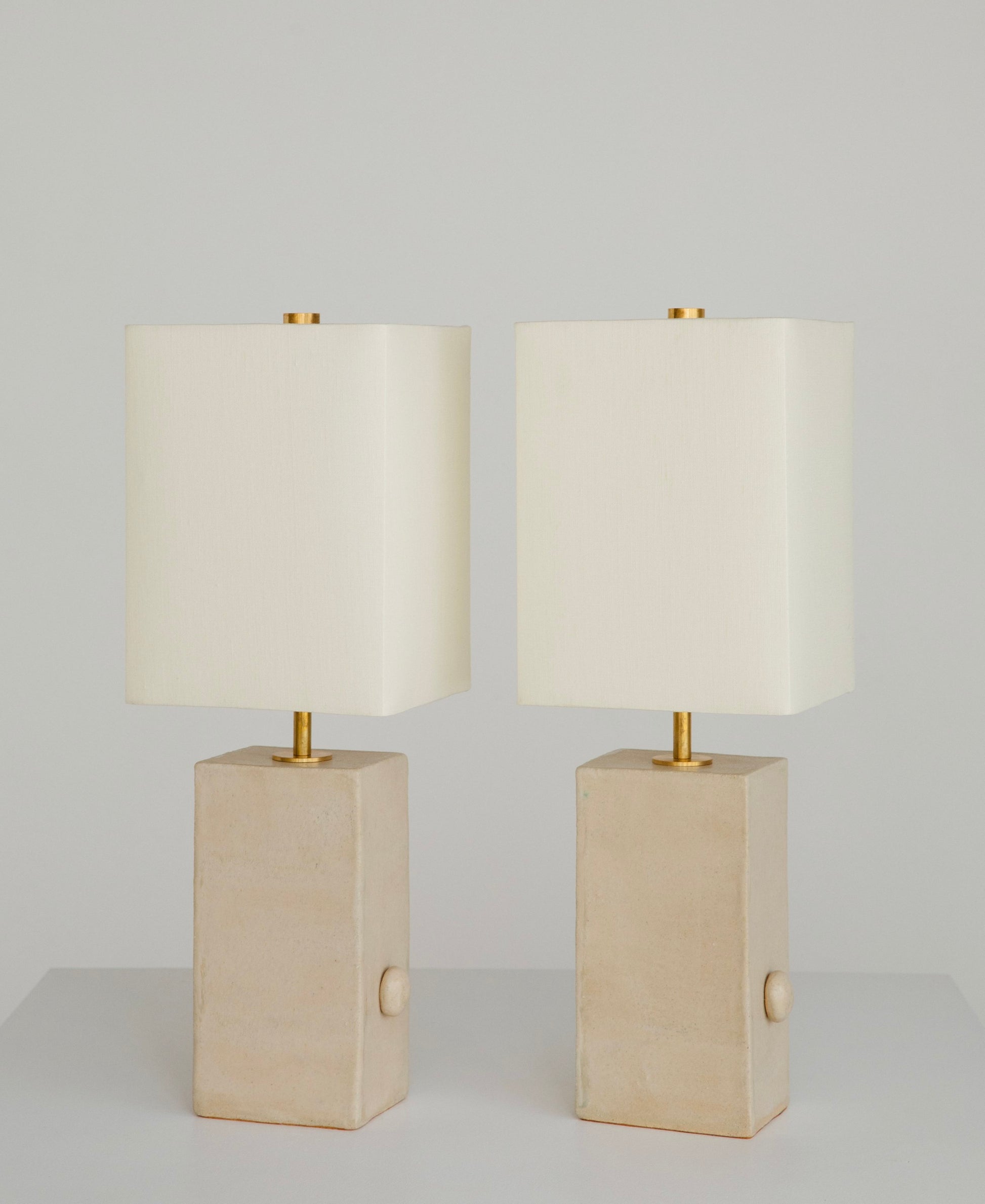 Creamy white fabric softens the structured presentation of a rectangular shade