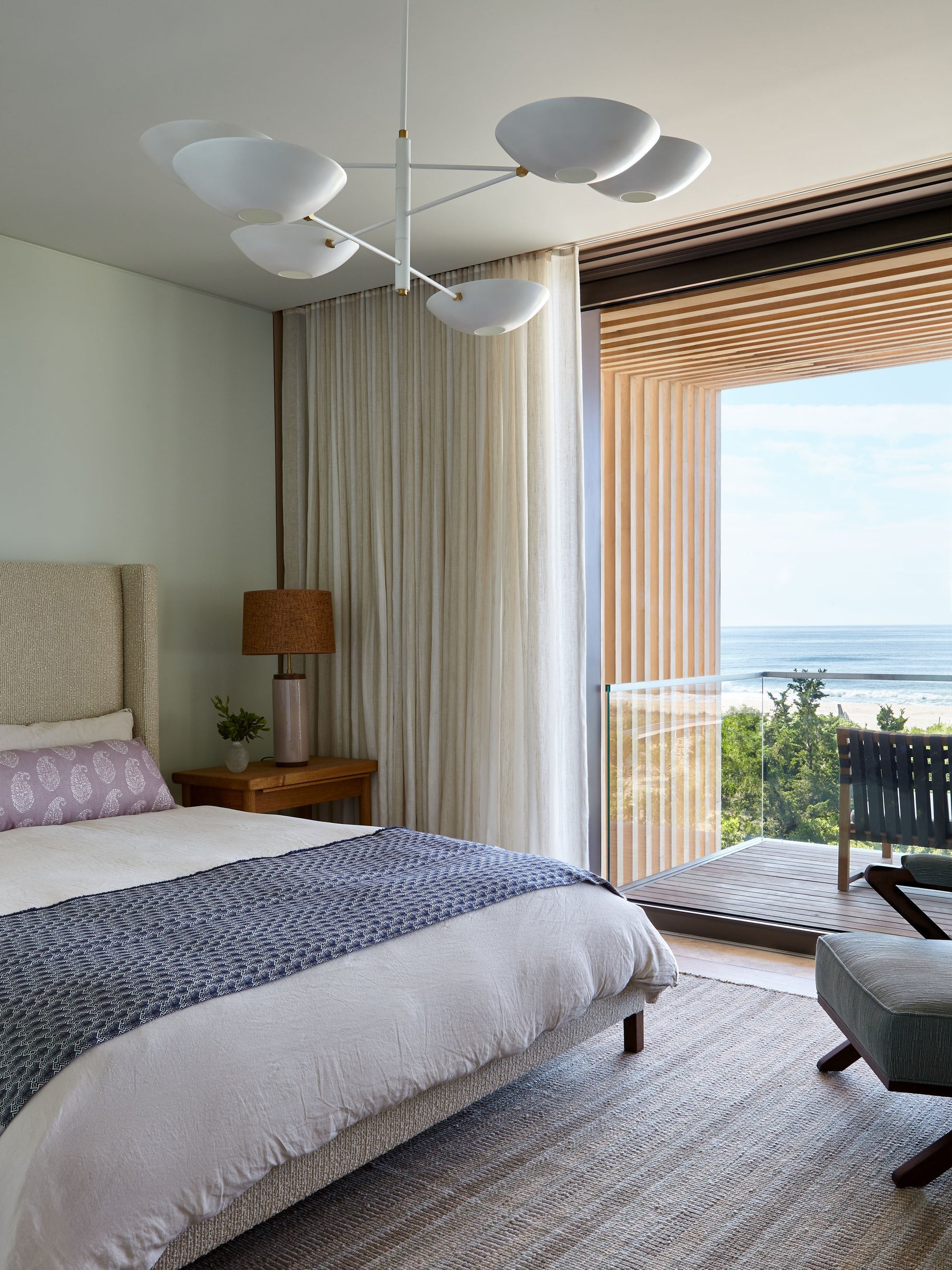 Gentle bowl-shaped shades cast soft light from his modern chandelier