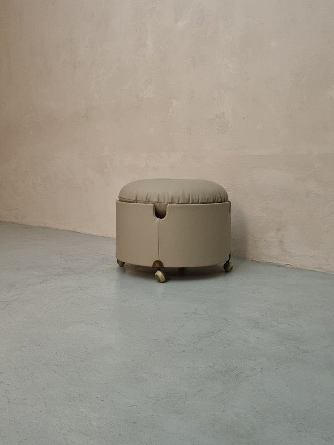 Bring flexibility and comfort to your living spaces with this vintage pouf, designed in the late 1960s. It's in excellent restored condition, creating a refined look that pairs a curved structure with a wheeled base and leather upholstery that offers impeccable comfort and richness. Use the pouf as flexible seating or as an ottoman when relaxing.