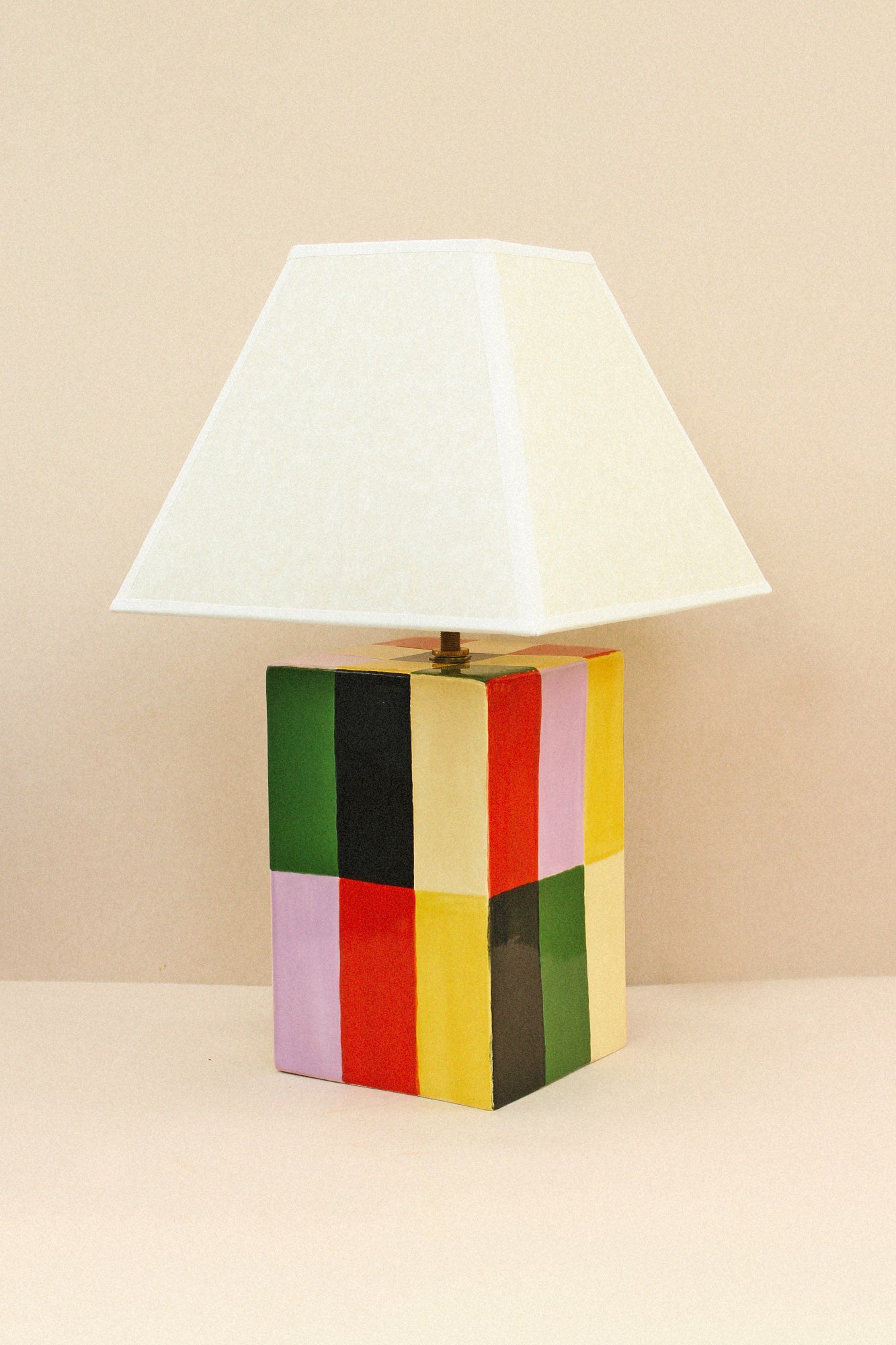 Inject color in a modern living space with a handmade ceramic table lamp designed to make a statement. Its checkerboard pattern is colorful and vibrant, perfect for drawing attention on a side table or console. Its rectangular ceramic base is crafted by hand, and then painted to create an artisan effect sure to enliven you living space.