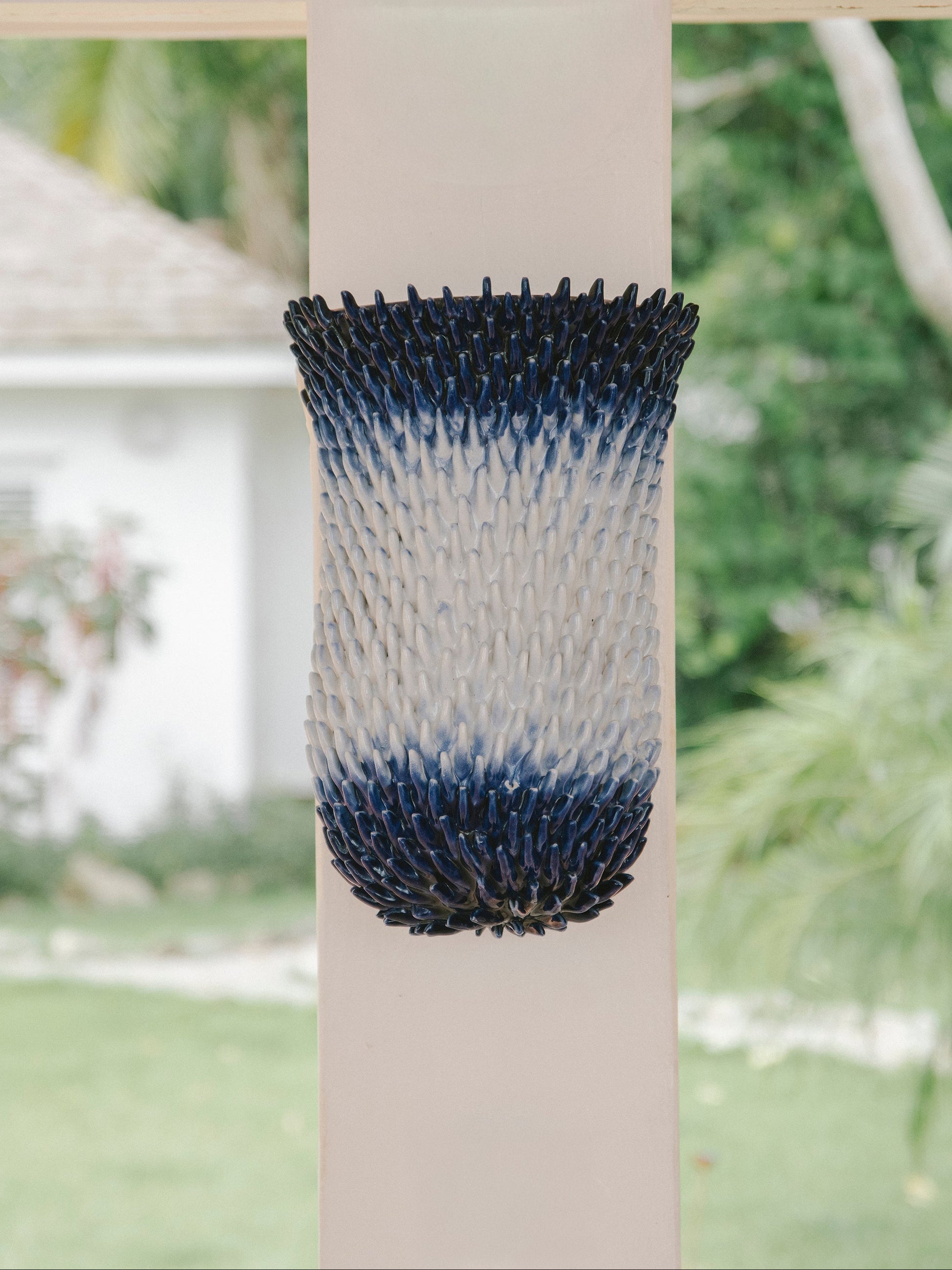 The carefully sculpted ceramic shade of this pineapple-textured wall sconce transforms an existing sconce socket with a curated coastal vibe. Light grows upward through the open top, washing the wall with light as its tactile surface adds depth in shadow. Use it in entries, stairways, or framing a couch or chair as an upgrade that feels timeless and bespoke.
